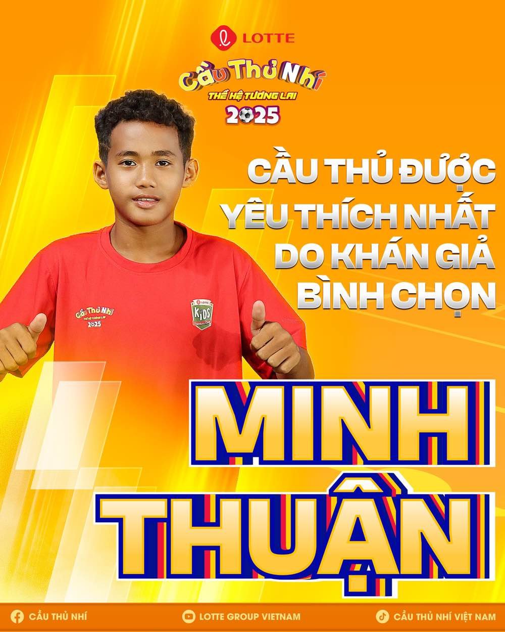 Kết thúc 10 ngày bình chọn, cầu thủ nhí Lê Minh Thuận (12 tuổi, Đồng Nai) đã xuất sắc vượt lên dẫn đầu, trở thành thí sinh giành danh hiệu “Cầu thủ nhí được yêu thích nhất do khán giả bình chọn”. Minh Thuận đạt con số tương tác ấn tượng với hơn 3,3 nghìn lượt comment và 19 nghìn lượt chia sẻ, vượt qua nhiều cái tên nổi bật khác như Minh Khôi hay Quang Huy.