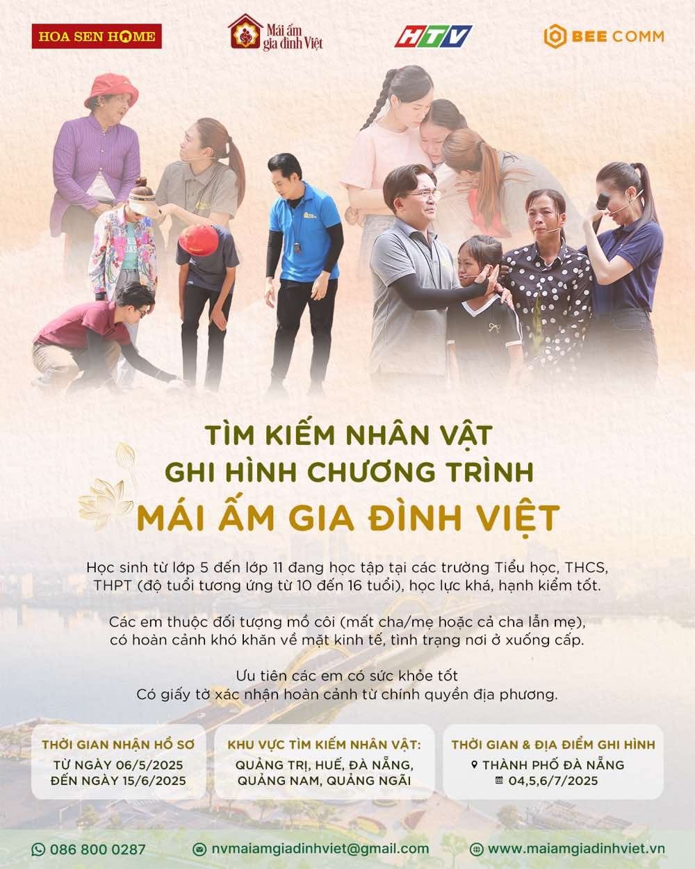 Hiện tại, hành trình tìm kiếm nhân vật cho 3 ngày ghi hình tại TP. Đà Nẵng vẫn đang được ê-kíp Mái ấm gia đình Việt gấp rút tiến hành. Điều kiện tham gia chương trình gồm: (1) Học sinh từ lớp 5 đến lớp 11 đang học tại các trường Tiểu học, THCS, THPT với độ tuổi tương ứng từ 10 đến 16 tuổi có học lực khá, hạnh kiểm tốt. (2) Các em nhỏ thuộc diện mồ côi (mất cha/mẹ hoặc mất cả cha lẫn mẹ), có hoàn cảnh khó khăn về mặt kinh tế, tình trạng nơi ở xuống cấp. (3) Ưu tiên các em nhỏ có sức khỏe tốt, có giấy tờ xác nhận hoàn cảnh từ chính quyền địa phương.